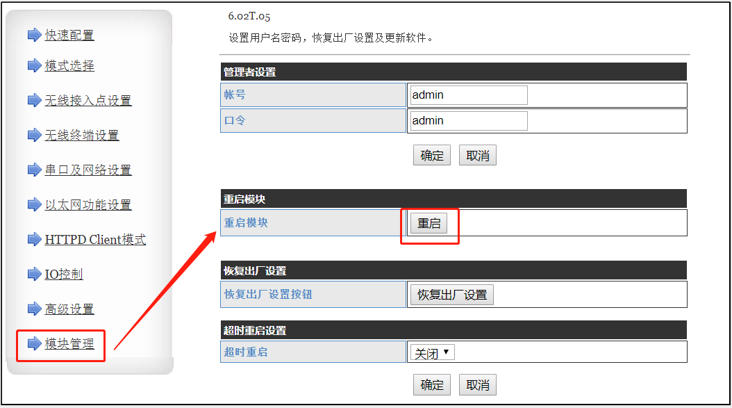 PC连接模块无线SSID,打开浏览器地址栏输出10.10.100.254,账号密码输入admin,即可进入模块内置网页,模块网口直连电脑。