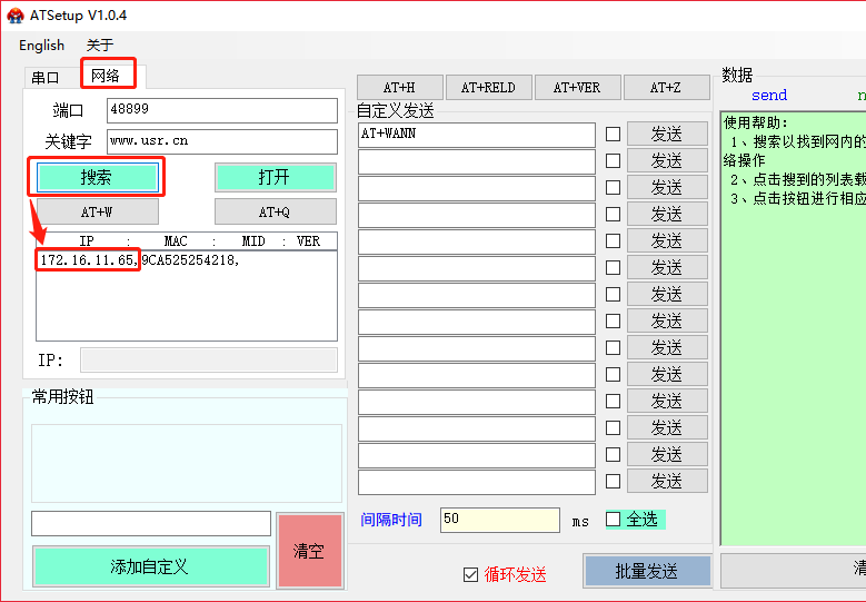 2、串口AT指令模式查询模块WAN口IP。搜索软件下载链接:http://www.usr.cn/Download/91.html