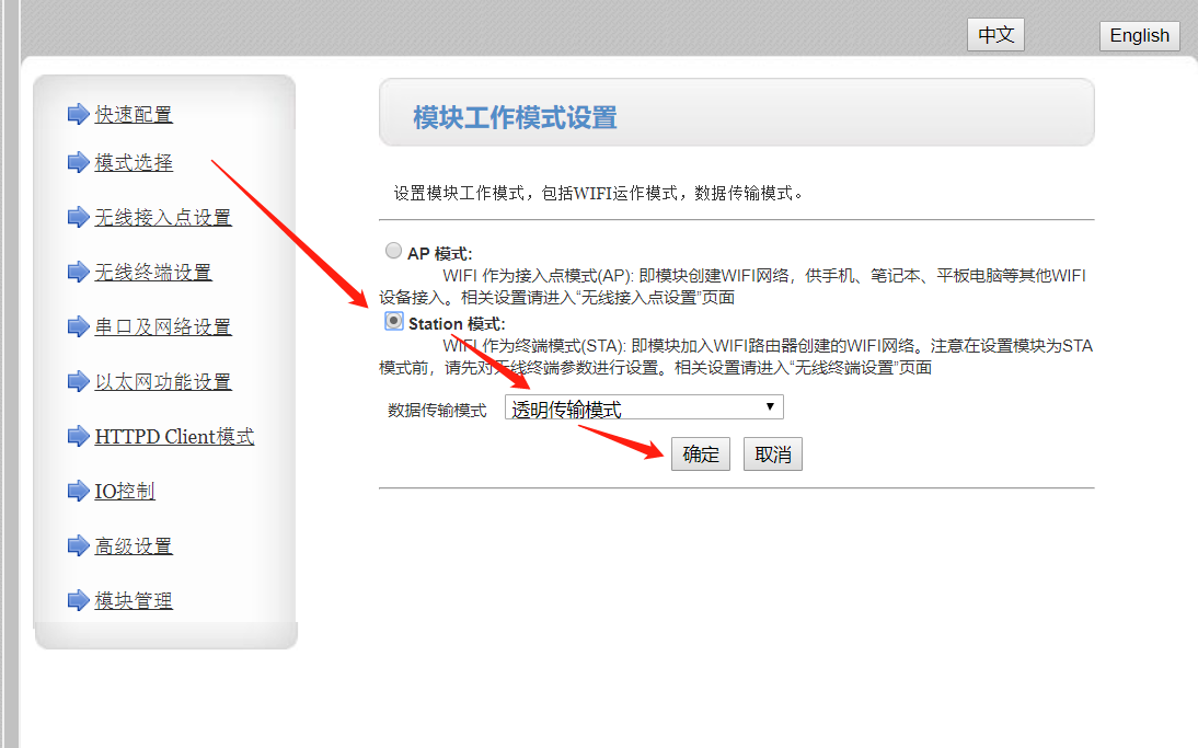 2.用浏览器打开B2的IP地址(出厂默认10.10.100.254),用户名和密码均是admin内置网页的账号和密码都是admin,进入以后选择模式选择模式选择为sta模式,点击确定;(先不要重启,等设置完所有的参数再重启设备)