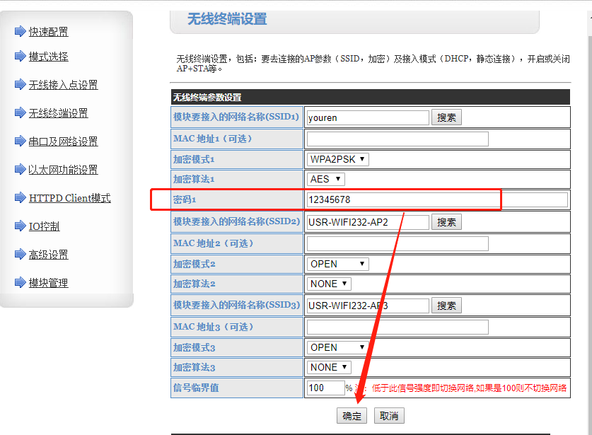 3.进入无线终端设置,搜索要连接的WiFi,选中以后点击确定,输入密码,设置完成后同样需要点击确定