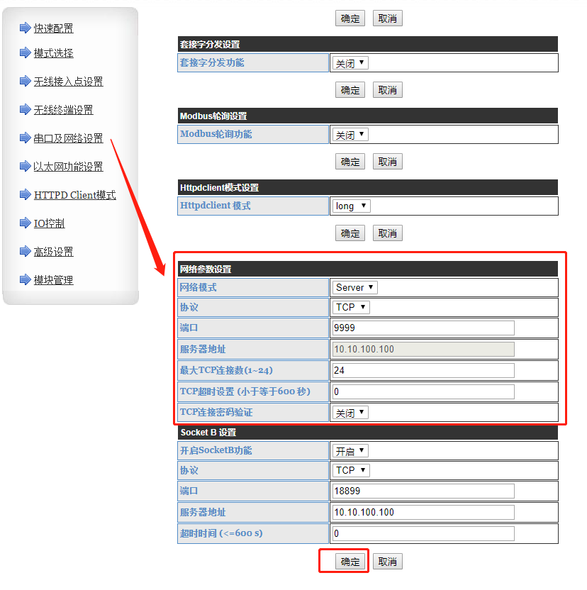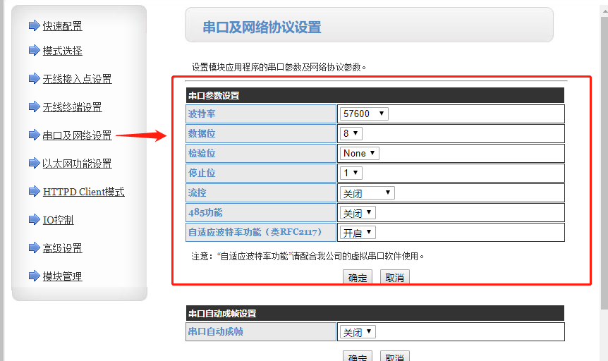 4.在模块“串口与网络设置”中可设置模块的串口参数(串口参数要与您要接的串口设备一致),点击确认。