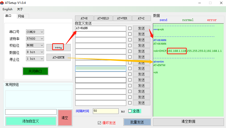 6.使用AT设置软件打开串口,点击“+++a”模块返回+ok进入配置状态,发送AT+WANN查询模块STA模式下获取的IP, 查询完成使用AT+ENTM退出配置, 点击关闭串口。