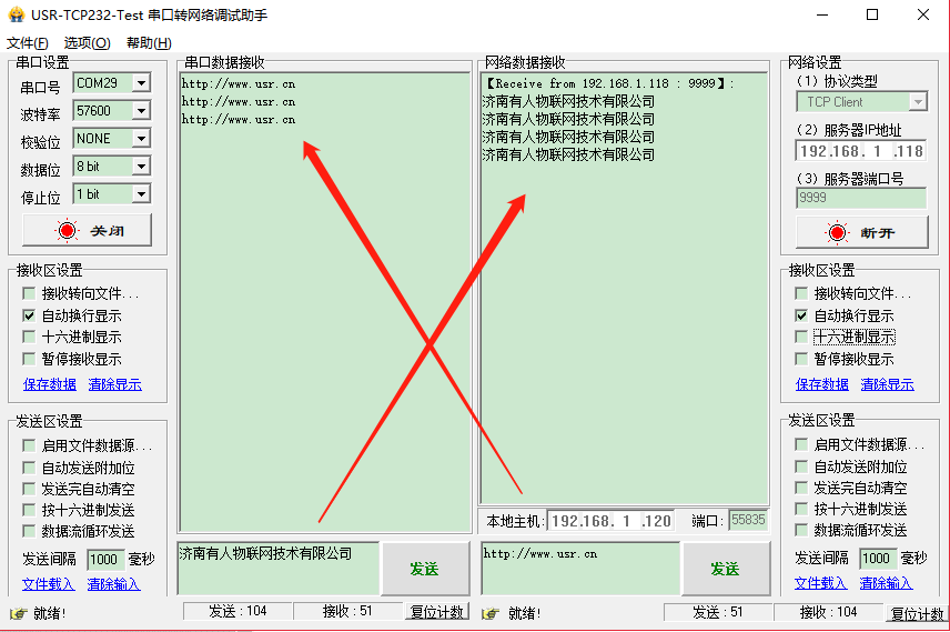 6. 数据测试,电脑也接入B2接入的路由器网络,打开小黄人串口网络调试助手,实现透传数据。