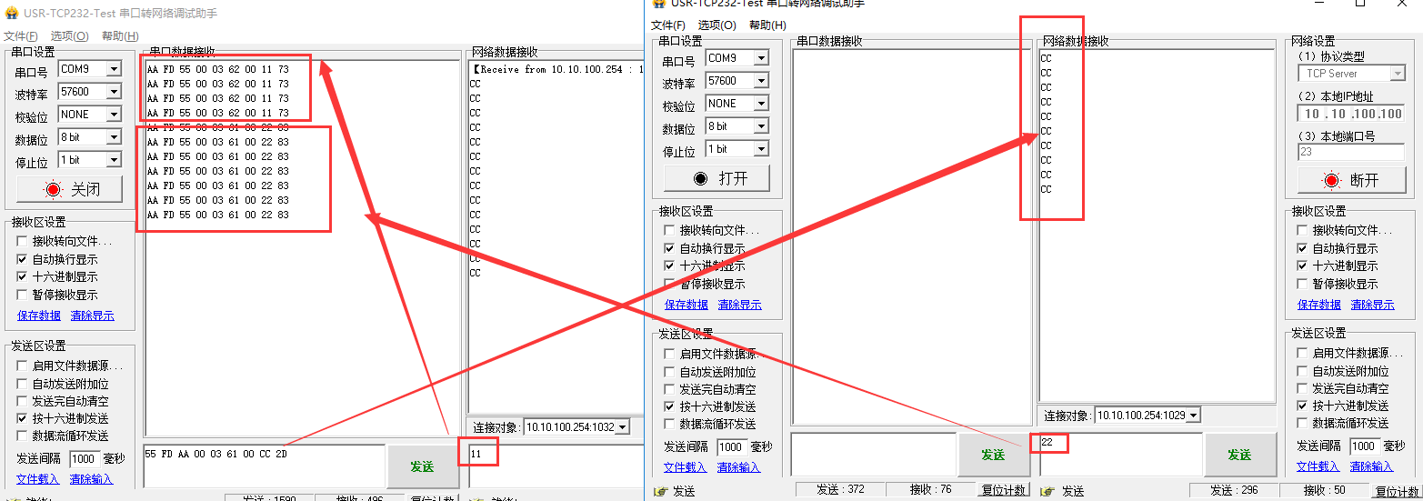 因为本次测试没有接dtu,所以,我们在网络端回发的时候,不需要加格式,只是单纯的发送数据就可以了!