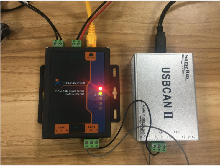 将USR-CANET200接上标准的电源适配器(端子供电),通过网线直连的方式,连接到电脑,将can转usb的can1接到cannet200的can1口上,usb口接电脑usb口,485转usb一端接can的485口,一端接电脑usb口。