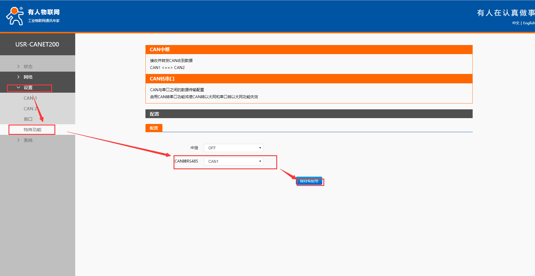 2. 浏览器输入地址192.168.0.7,进入canet200的内质网页,选择设置->特殊功能->can转485->打开can1,如图所示,然后重启。