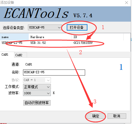 选择设备类型为“USBCAN-V5”然后打开设备选择Can1,点击确定