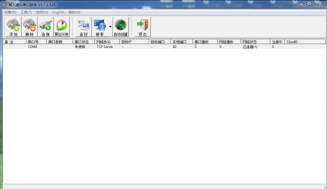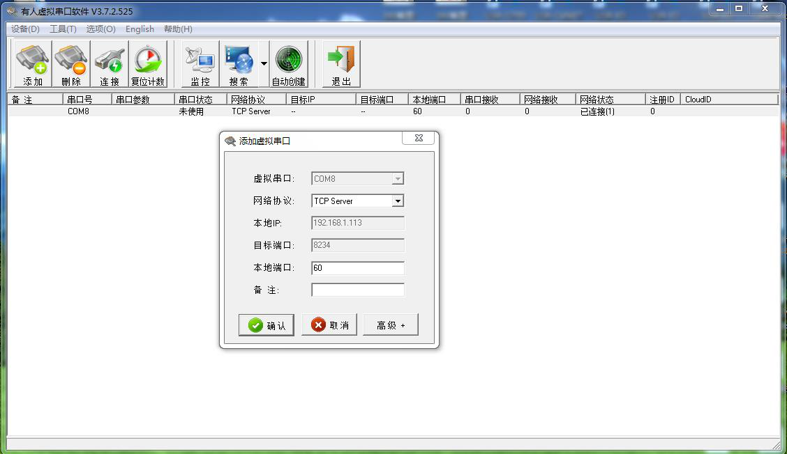 电脑用虚拟串口软件建立一个虚拟串口COM8,做TCP server,服务器,本地端口60。