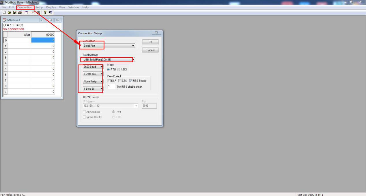 USB-RS232或者USB-RS485串口线接USR-TCP232-304串口和电脑USB口,MODBUS SLAVE软件打开COM口,模拟客户串口MODBUS RTU设备。串口参数设置和USR-TCP232-304串口参数一致。