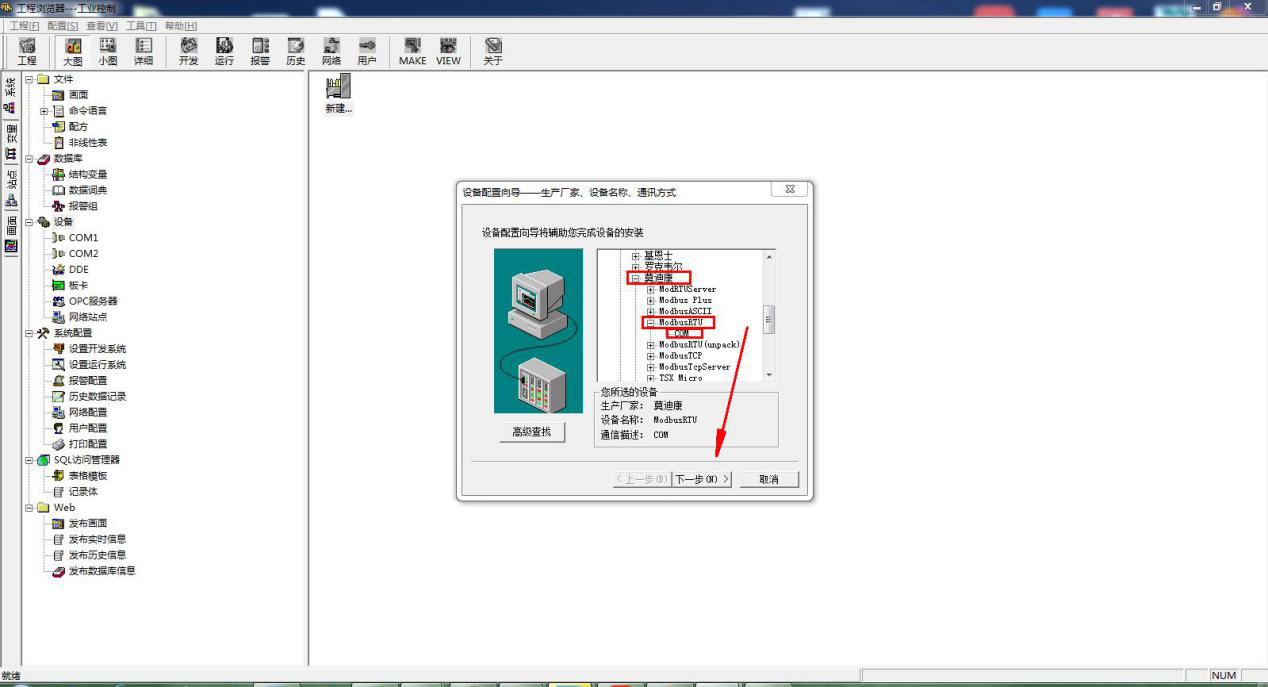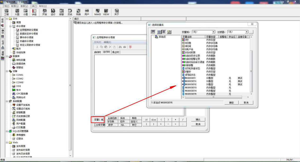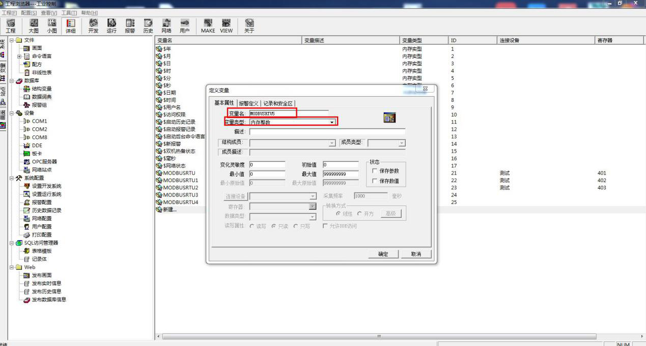 新建变量名 MODBUSRTU5,选择变量类型内存整数。