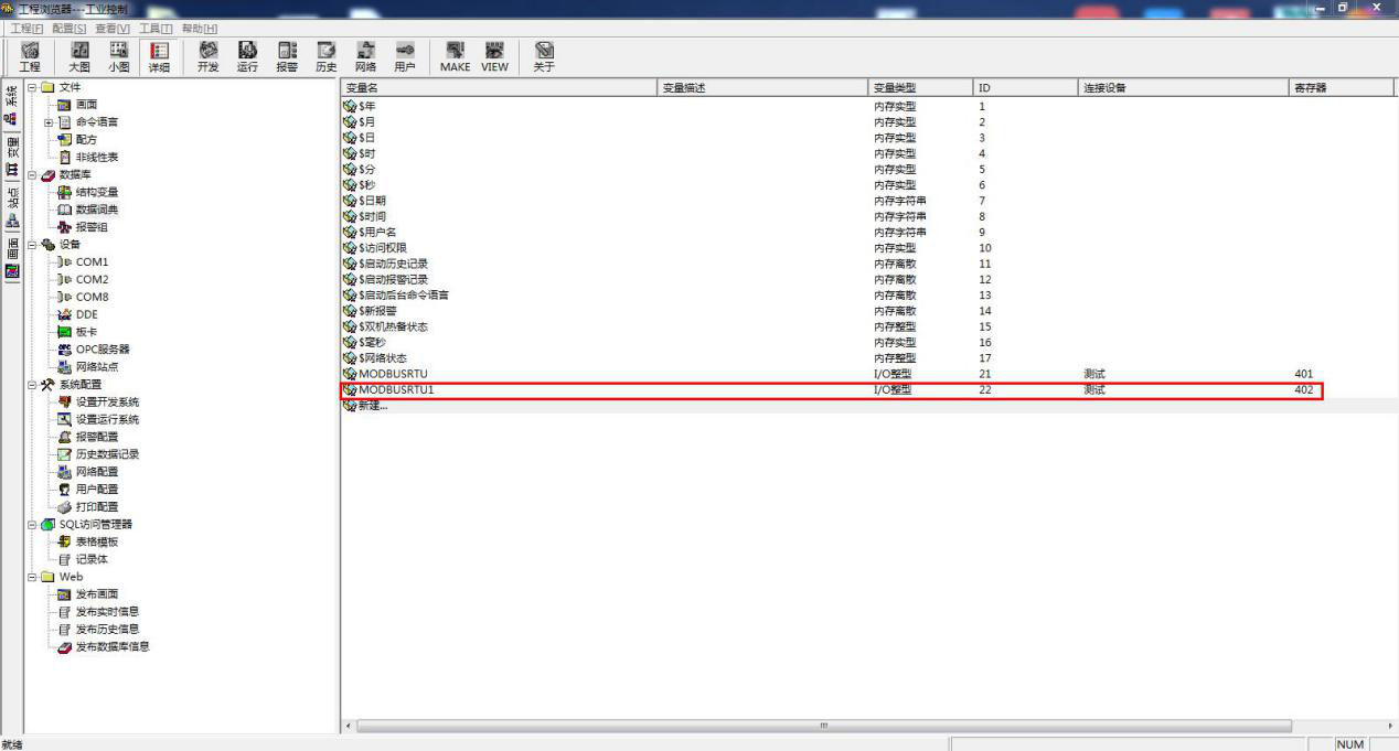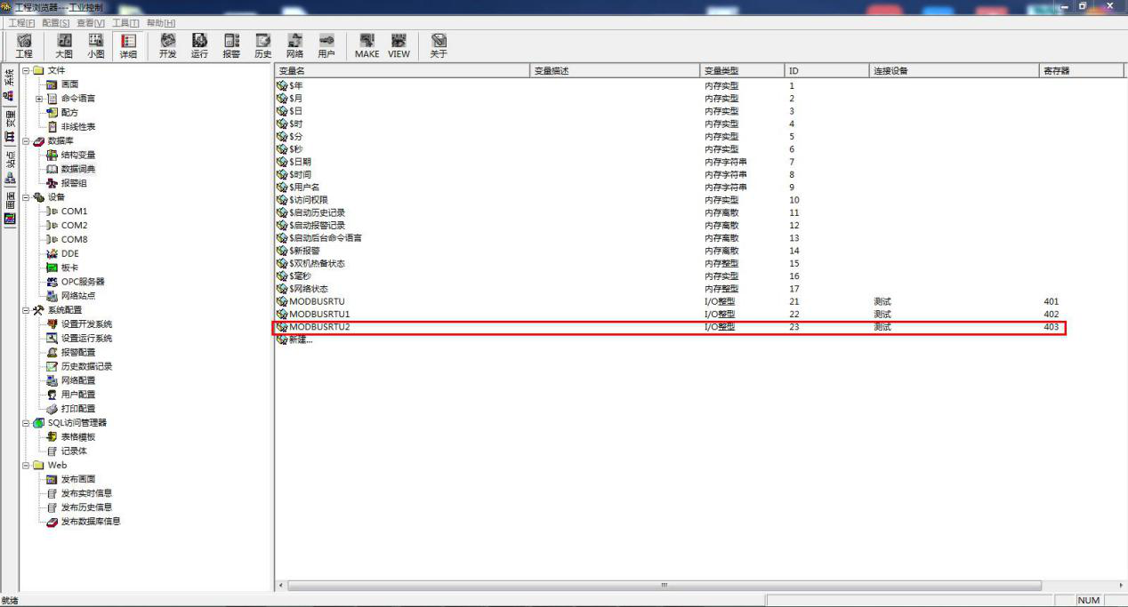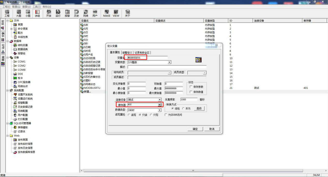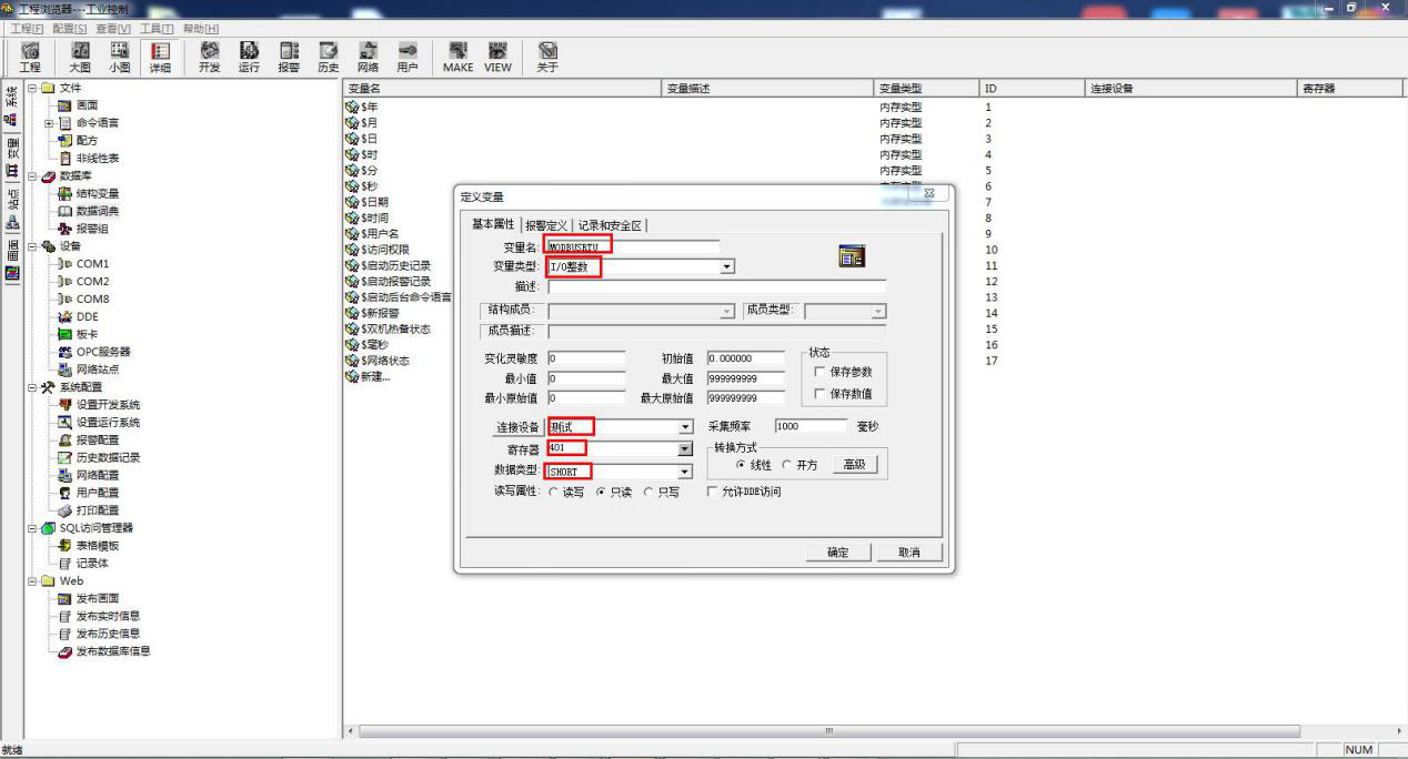 新建变量名 MODBUSRTU,选择变量类型 IO 整数。连接设备为新建的设备名:新建 IO 设备,寄存器 401,代表功能码为 03,起始地址 0 的第一个值