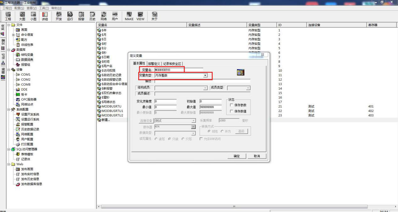 新建变量名 MODBUSRTU3,选择变量类型内存整数。