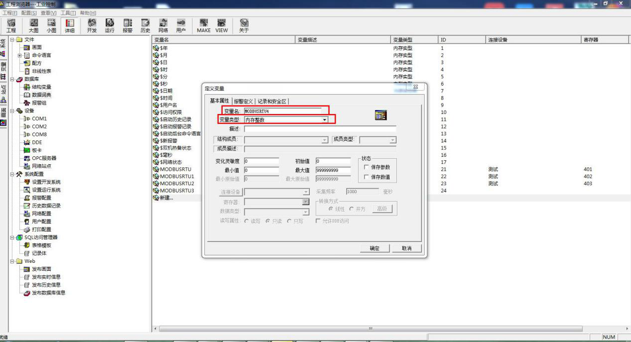 新建变量名 MODBUSRTU4,选择变量类型内存整数。