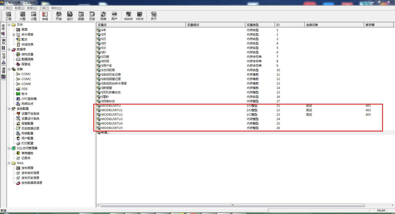 新建了 6 个变量,三个 IO 变量,分别采集串口设备数据。三个内存变量。