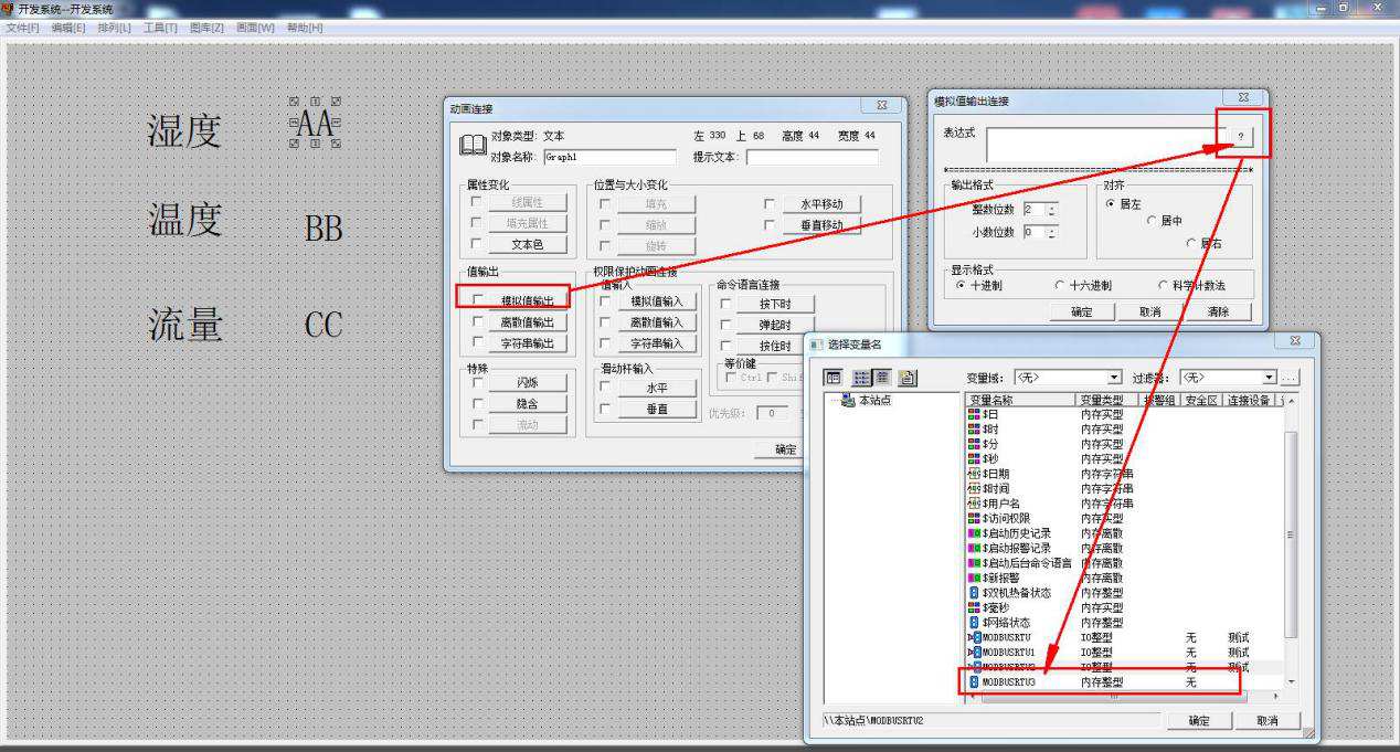 双击其中一个文本 CC,然后点击模拟值输出,在表达式内选择变量名 为 MODBUSRTU5,然后确定。意思是MODBUSRTU5 的值是设备寄存器地址2中的数据值,然后将数值 传到画面CC