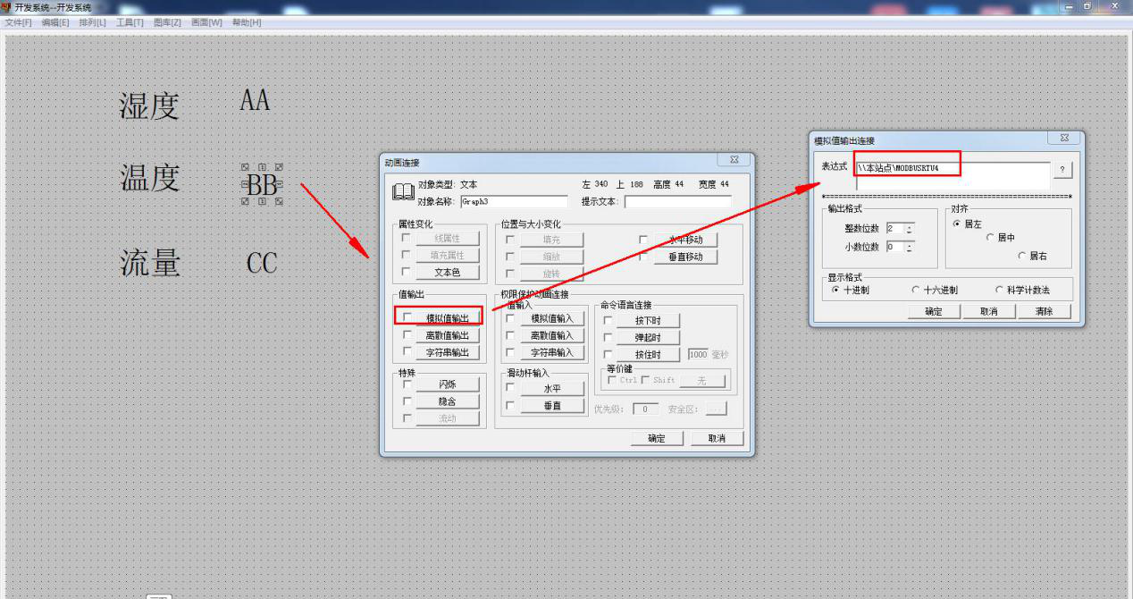 双击其中一个文本 BB,然后点击模拟值输出,在表达式内选择变量名 为 MODBUSRTU4,然后确定。意思是MODBUSRTU4 的值是设备寄存器地址1中的数据值,然后将数值 传到画面BB