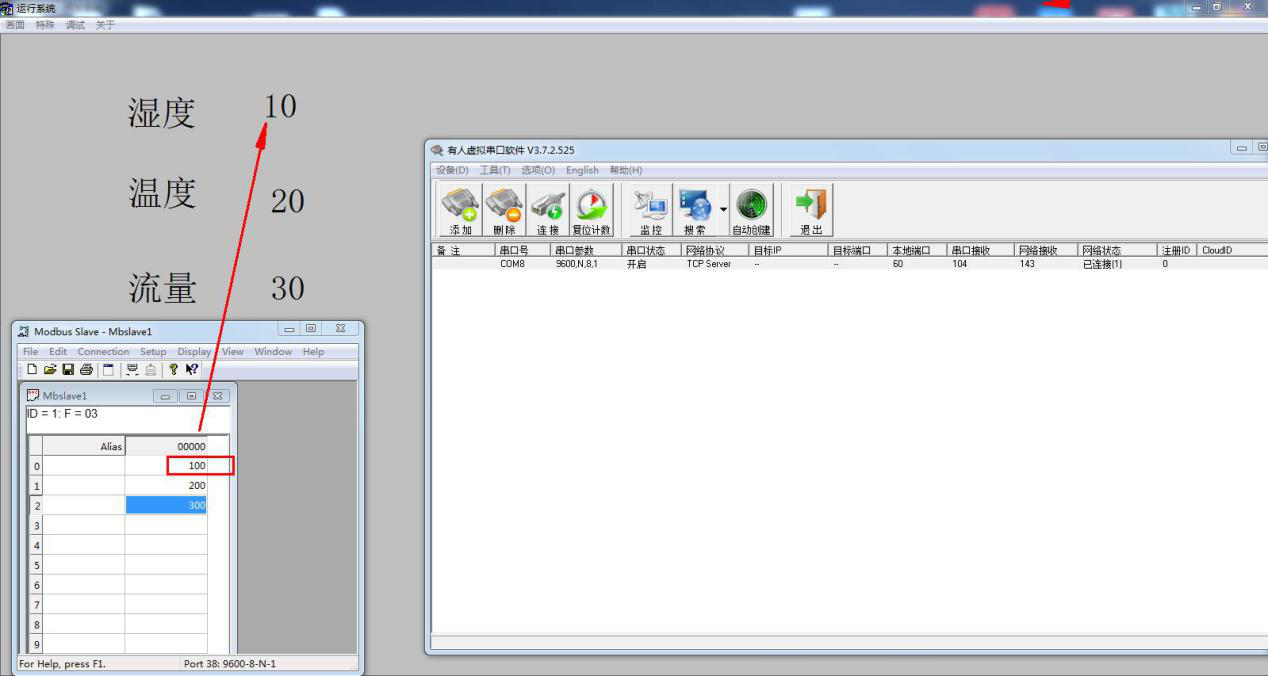 MODBUS SLAVE软件修改3个寄存器地址数据,组态王读取到串口设备3个寄存器地址数据,在页面上显示。