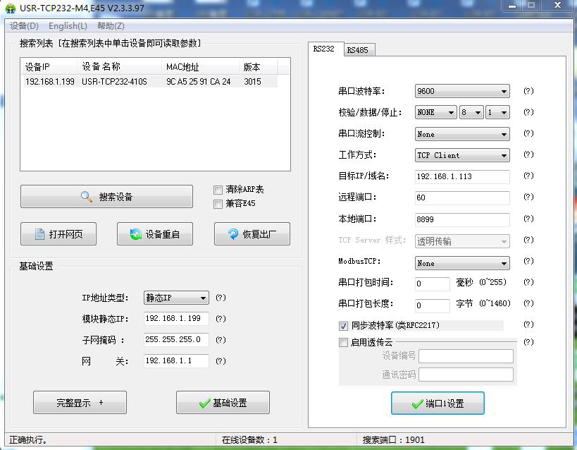 USR-TCP232-410S设置软件:http://www.usr.cn/Download/230.html