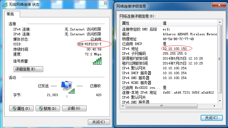 1:电脑搜索WiFi模块的网络,并连接上,查询电脑获取到的IP地址。