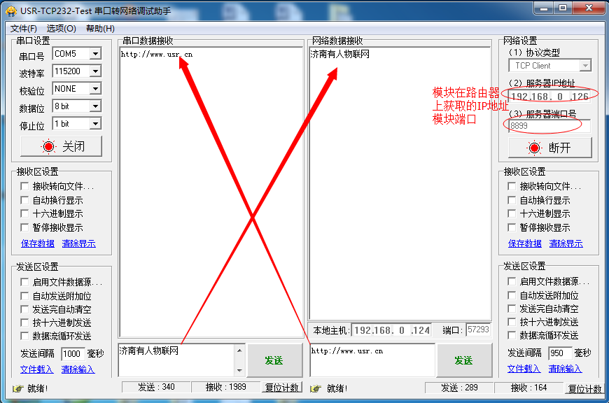 使用AT+WANN可以查询到无线路由给模块分配到的IP地址。通信地址就使用这个IP通信。以上网络调试助手和虚拟串口软件通信的IP都是以此IP为准。