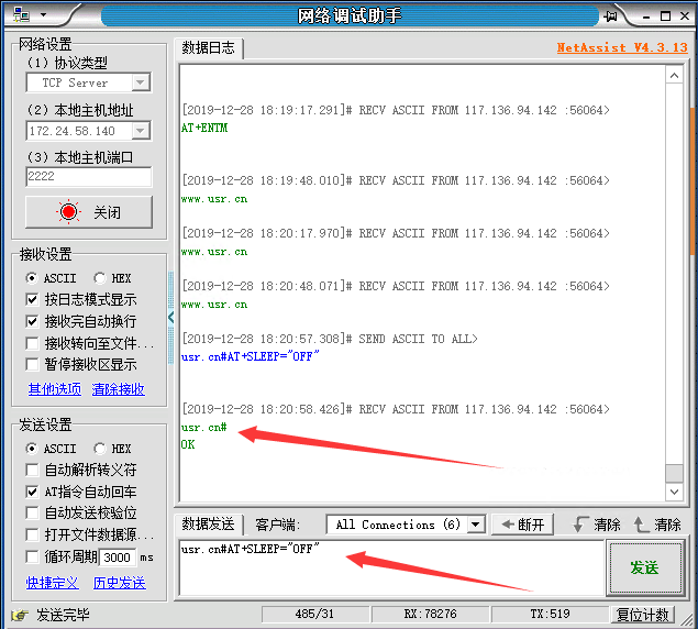 在此案例中,通过模块所连接的服务器下发网络AT指令激活,如下图。激活之后,模块将在10秒钟之内处于正常状态,若出现10秒钟无数据收发,则模块会再次进入低功耗模式。
