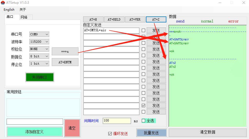 (2) 点击打开串口、点击“+++a”,串口返回“a+ok”,说明模块已经进入配置状态,发送“AT+SMTSL=air”,返回“+ok”后说明配置参数成功, 发送“AT+Z”重启模块时配置生效。