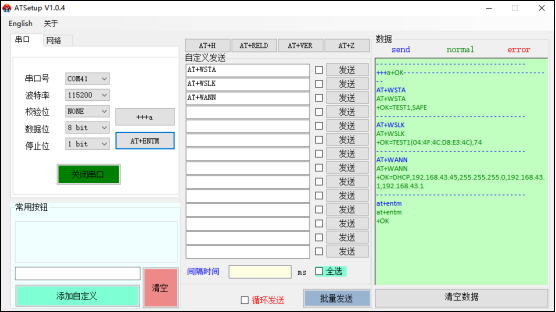 (5) 手机使用小红人软件打开串口,模块默认串口参数为: 波特率 115200、无校验、8 位数据位、1 位停止位。点击“+++a”,会返回+ok,说明已经进入命令行模式。