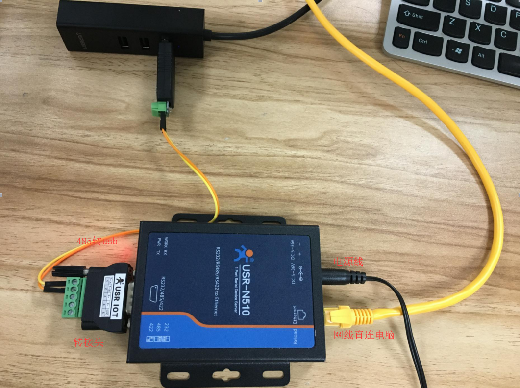 二、接线:电脑<——usb转485——转接头——N510——网线————>电脑