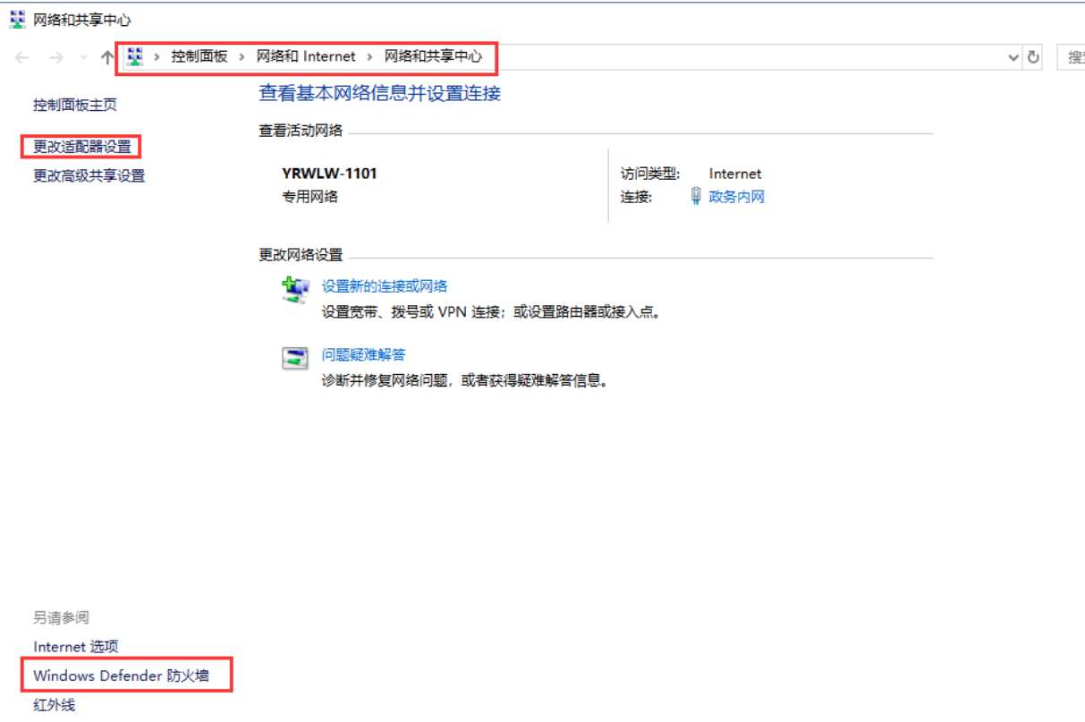 1、按路径:控制面板——网络和Internet——网络和共享中心找到“windows防火墙”和“更改适配器设置”选项,关闭防火墙并禁用与本次测试无关的网卡。并关闭电脑杀毒软件。