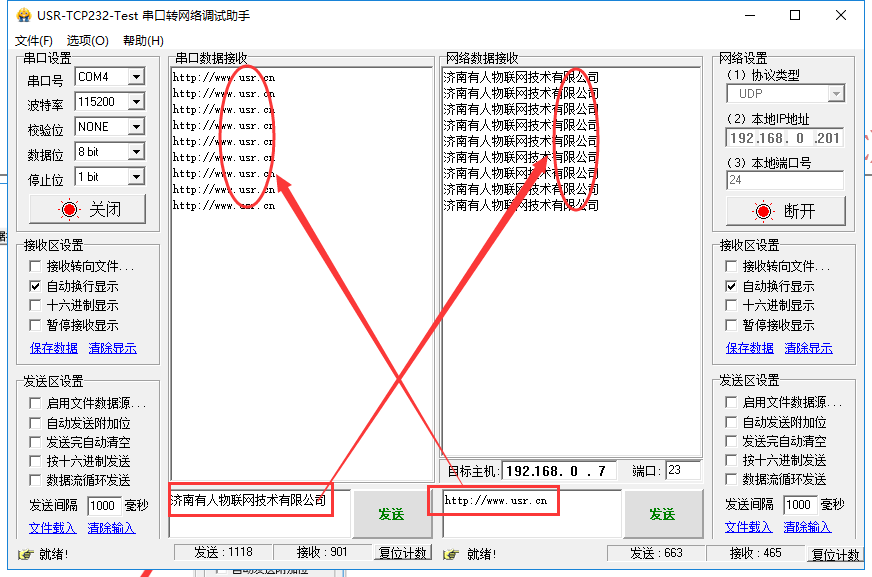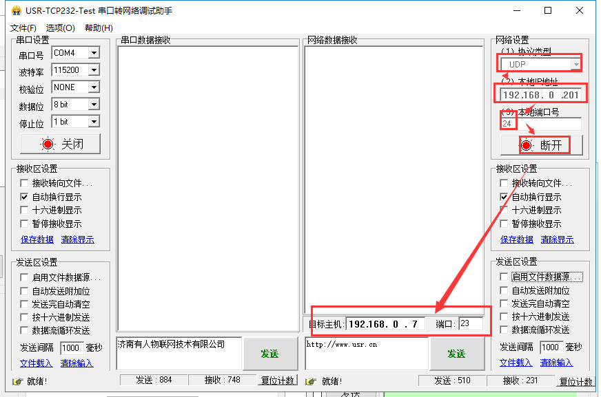 5、打开小黄人软件,右侧协议类型设置为UDP,本地ip为192.168.0.201,端口为24,点击连接,然后远程端口填写192.168.0.7,端口为23