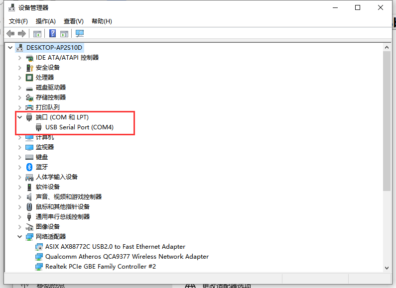 5、在设备管理器中查看端口信息,确定301串口使用的串口号,如下图所示电脑端口号为COM4。