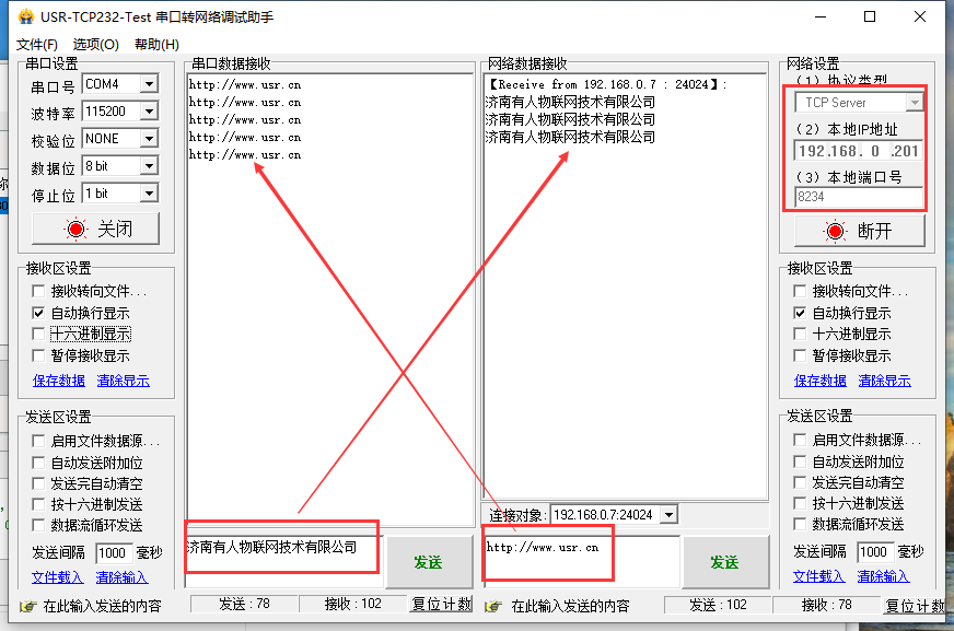 8、打开两个USR_TCP232_Test软件,一个连接COM4,一个连接虚拟串口COM1,实现两个串口直接数据互发。