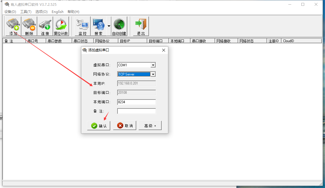 打开虚拟串口软件,点击“添加”在弹出的窗口中设置虚拟串口信息,由于上述301设备采用TCP Client协议,所以此处网络协议设置为TCP Server。本地端口号设置为301默认参数中的“远程端口”:8234。然后点击“确定”,建立虚拟串口COM1。