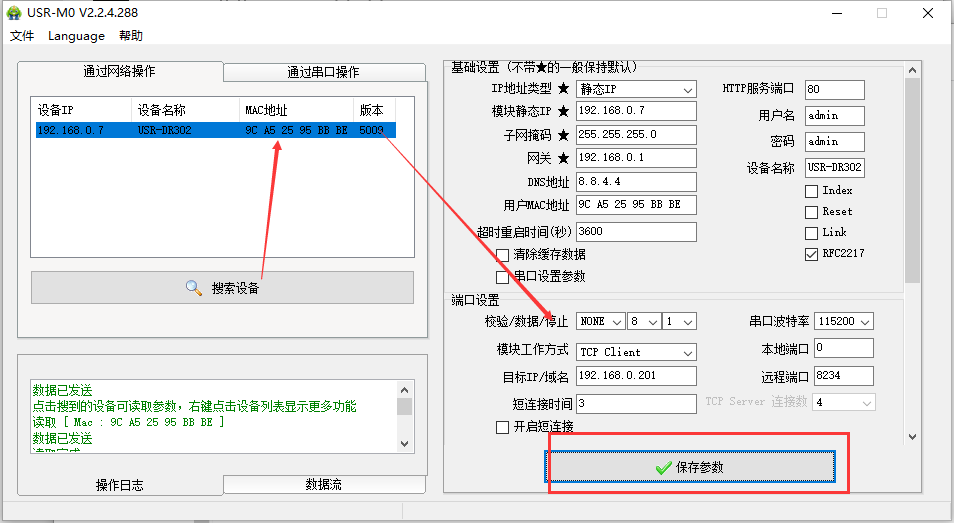 点击“搜索设备”当搜索列表中出现301的设备后,单击搜索到的设备,查看其配置信息(下图为默认配置信息)。