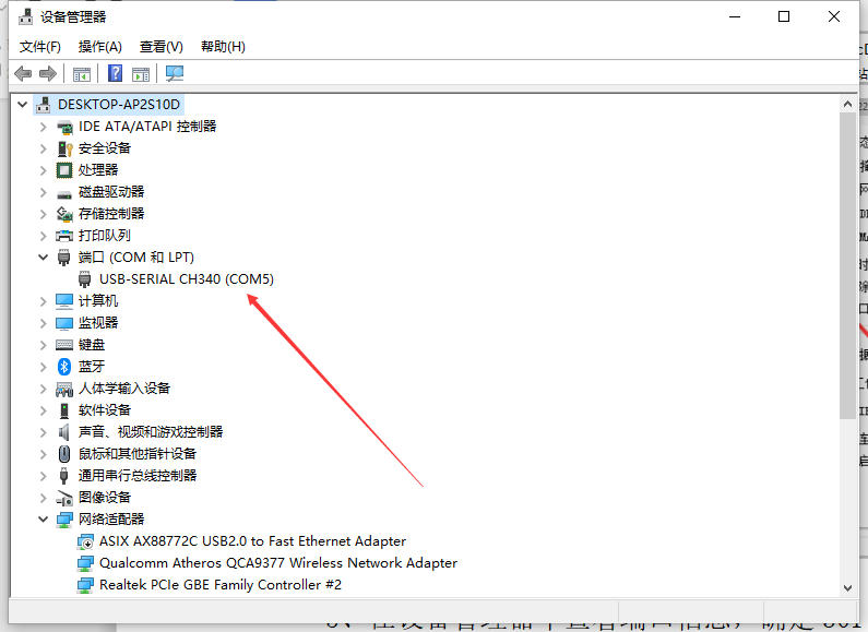 5、在设备管理器中查看端口信息,确定301串口使用的串口号,如下图所示电脑端口号为COM5。