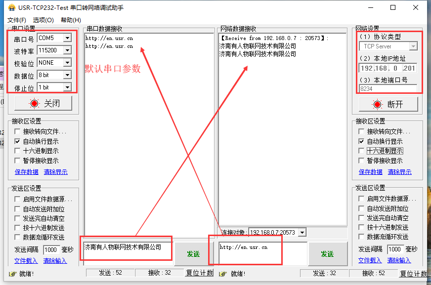 将软件串口设置中的串口号配置为COM4。由于设备默认协议类型为TCP Client,所以电脑端连接设备需要设置为TCP server。服务器IP设置为电脑IP:192.168.0.201。端口号设置为301默认参数中的“连接目标端口”:8234