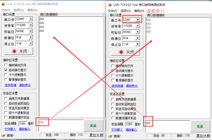 8、打开两个USR_TCP232_Test软件,一个连接COM4,一个连接虚拟串口COM1,实现两个串口直接数据互发。