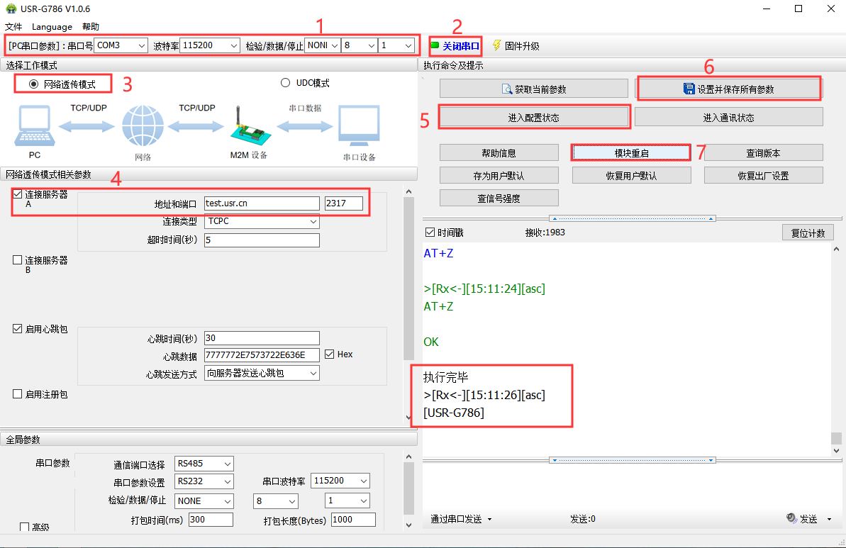 ④设置服务器IP和端口号,此处为我司测试服务器test.usr.cn,端口2317,测试服务器的功能是收到什么数据就发送什么数据;