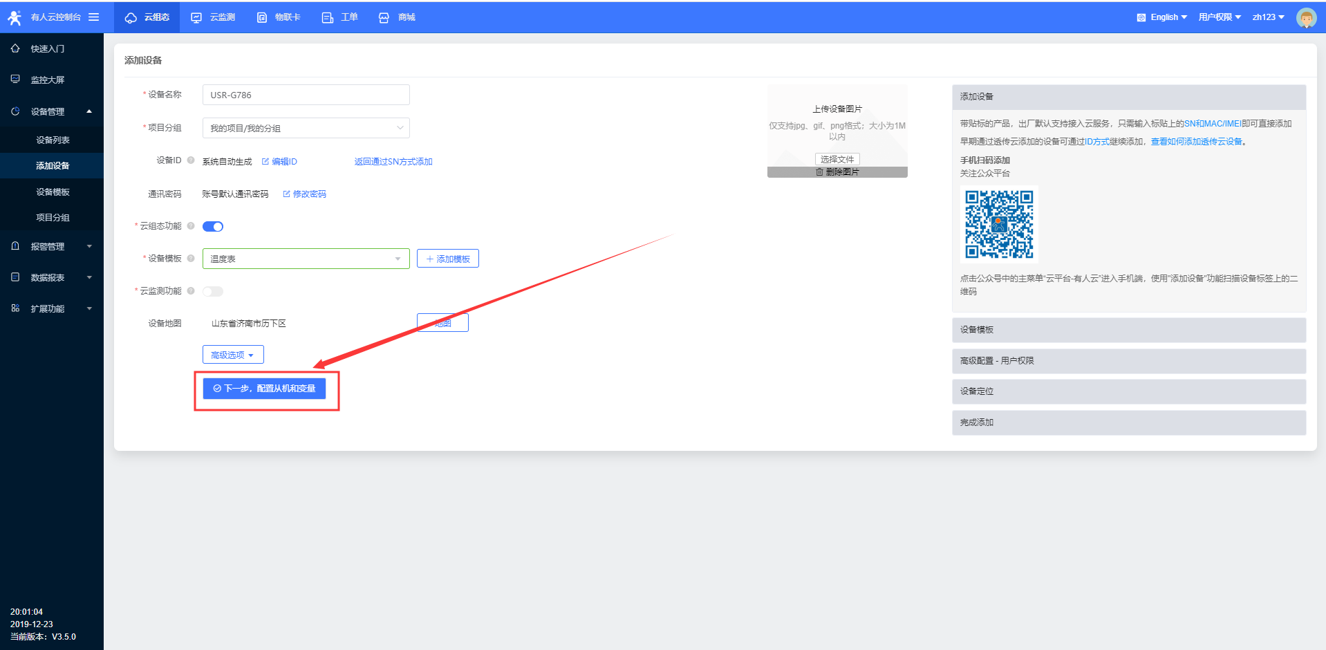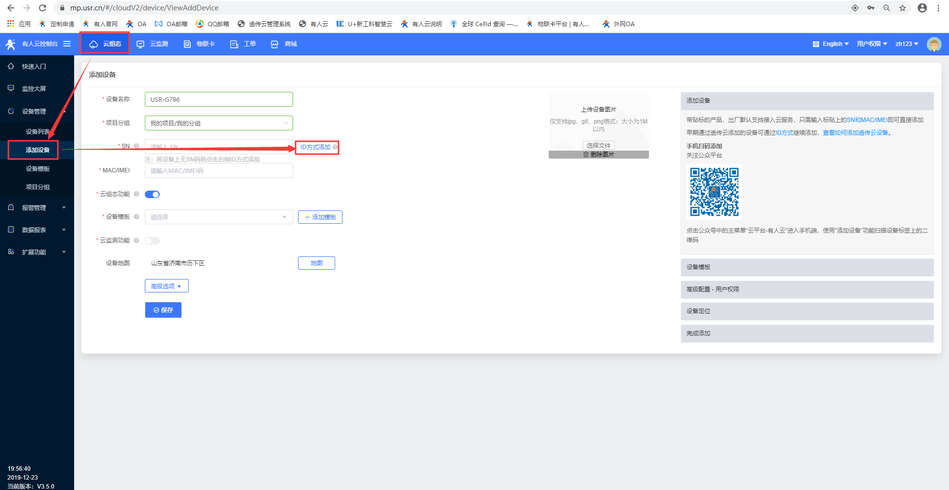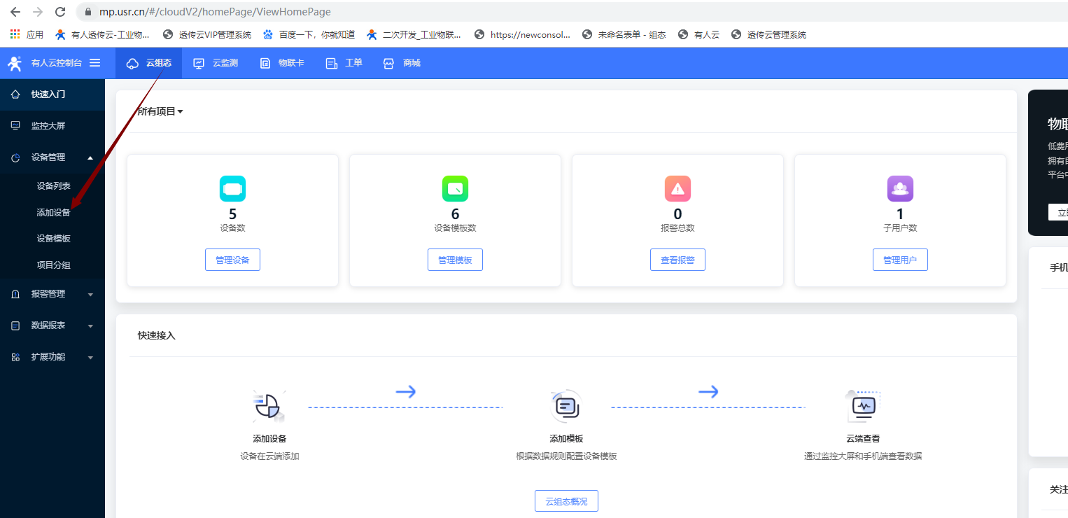 5、本次案例是USR-G786透传模式连接有人云进行数据显示,可以进入云组态,选择添加设备;