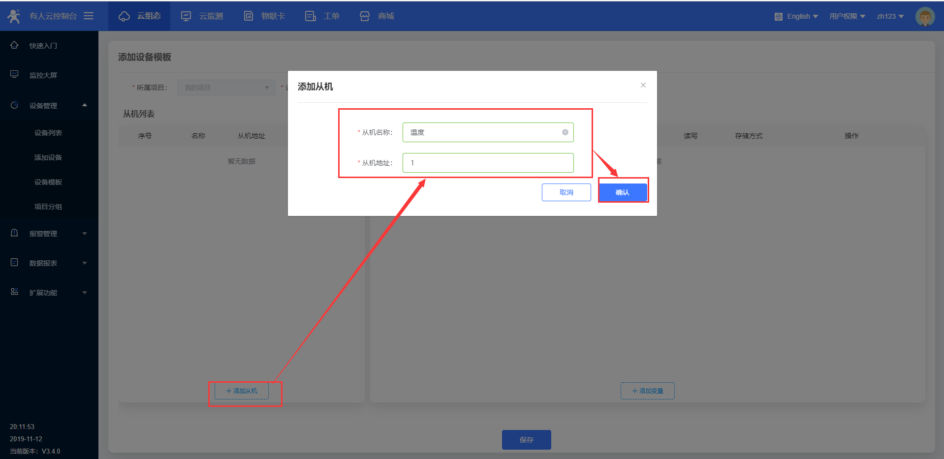 15、在有人云界面点击设备名称,可以看到刚才添加的从机变量;