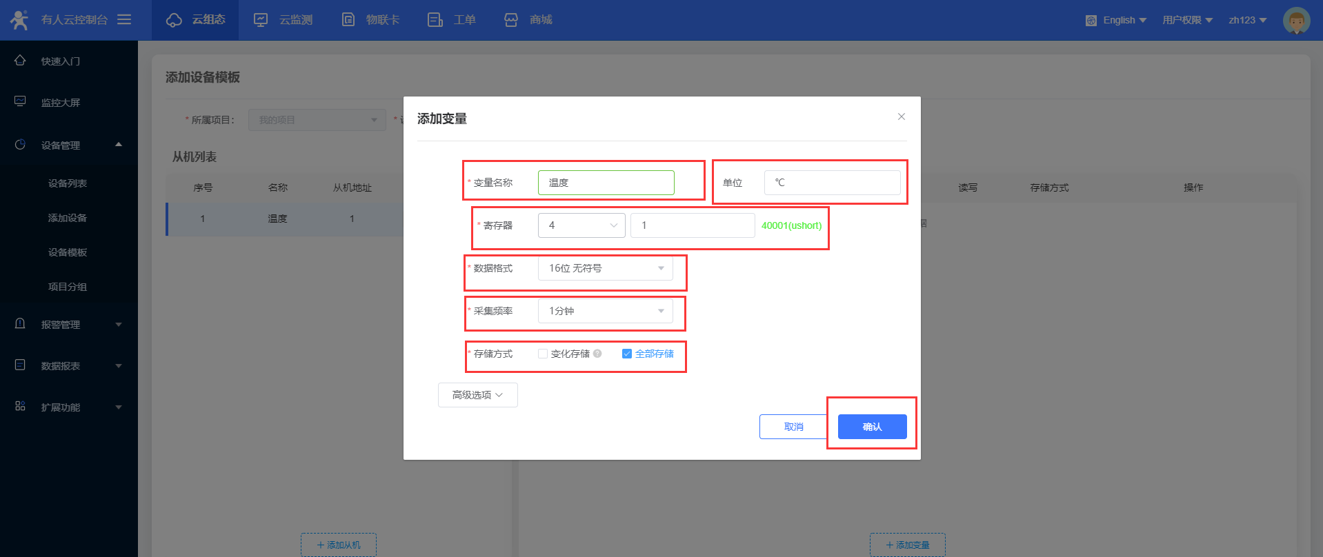 10、点击添加变量,设置变量的名称,寄存器地址,数据格式,采集频率(最低只能是一分钟);