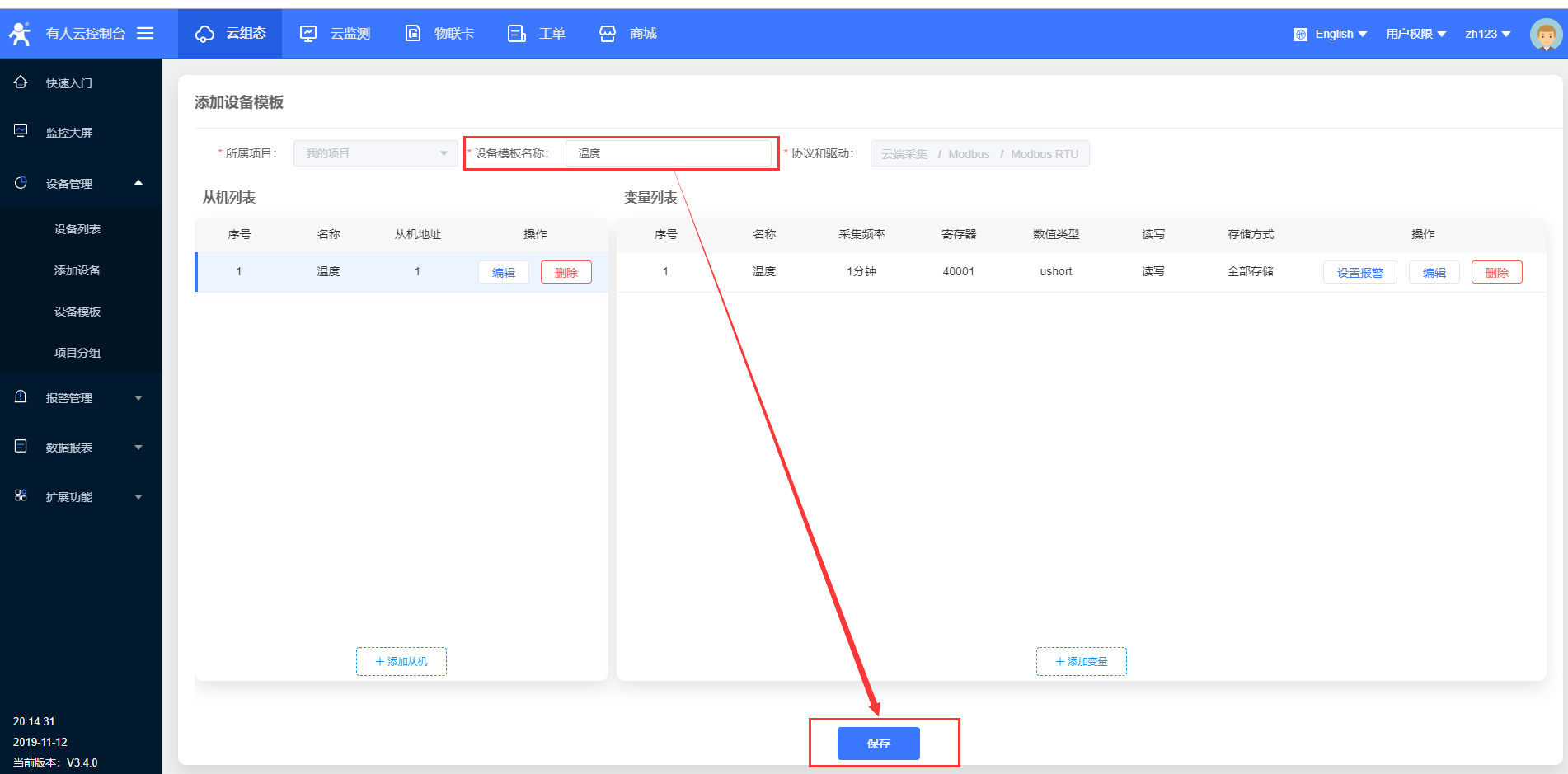 11、设置完从机和变量,根据需要设置一下模板名称,点击保存;