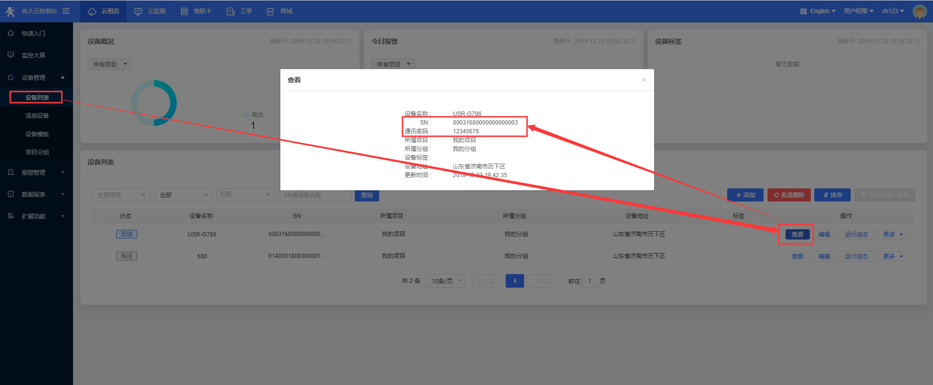 12、添加完设备,可以在设备列表看到刚刚添加的ID和密码(下面要用到);