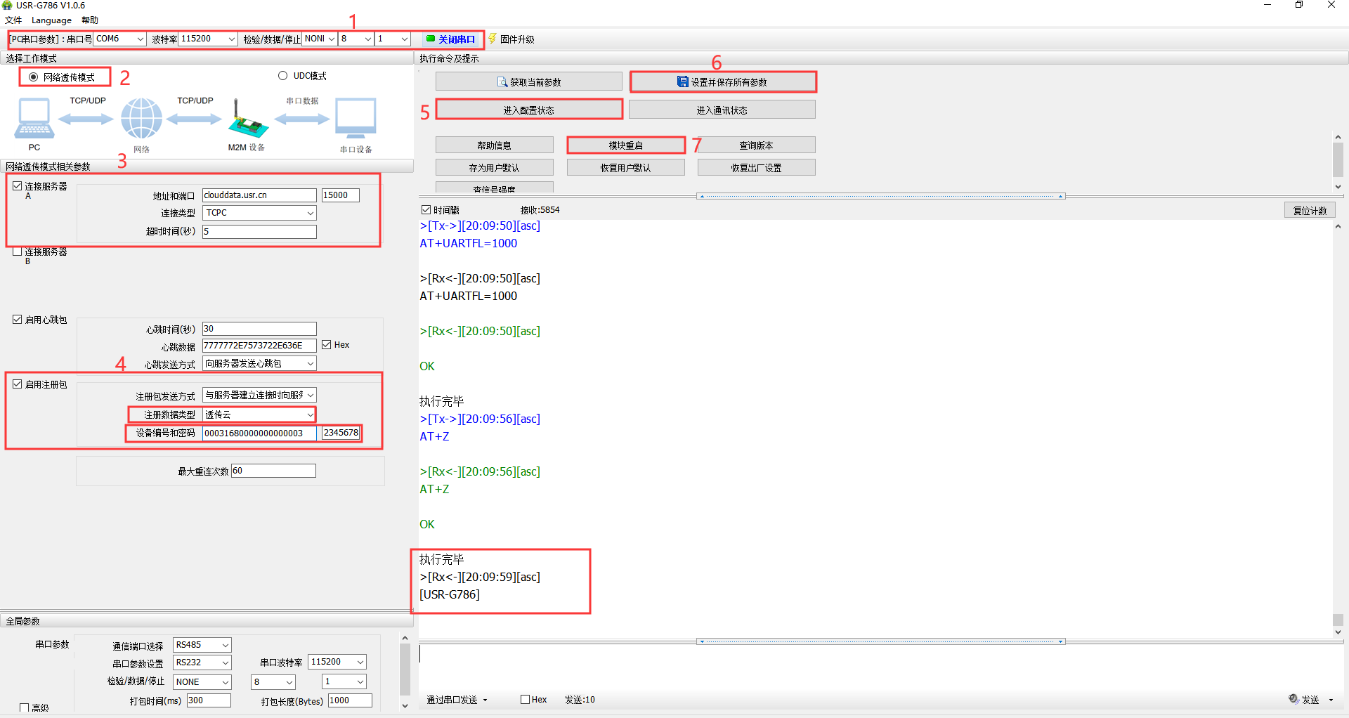 6>进入配置状态,返回OK后,点击设置并保存所有参数,绿色指令为成功;