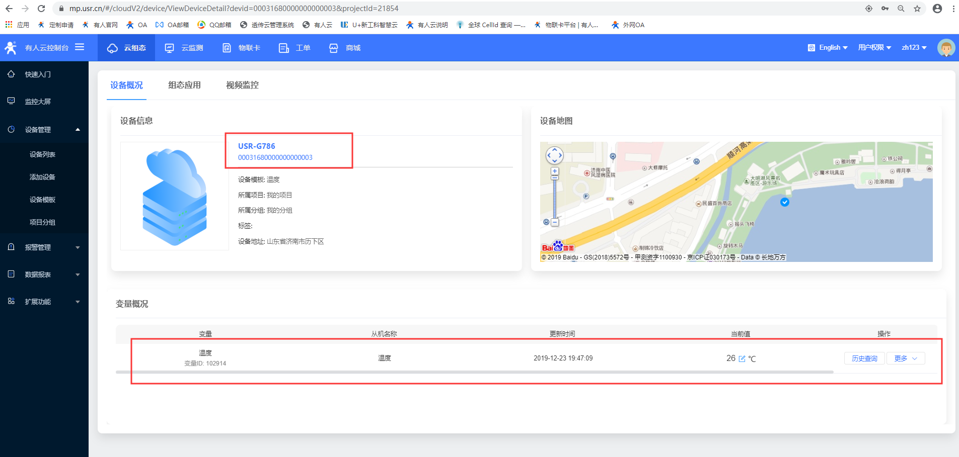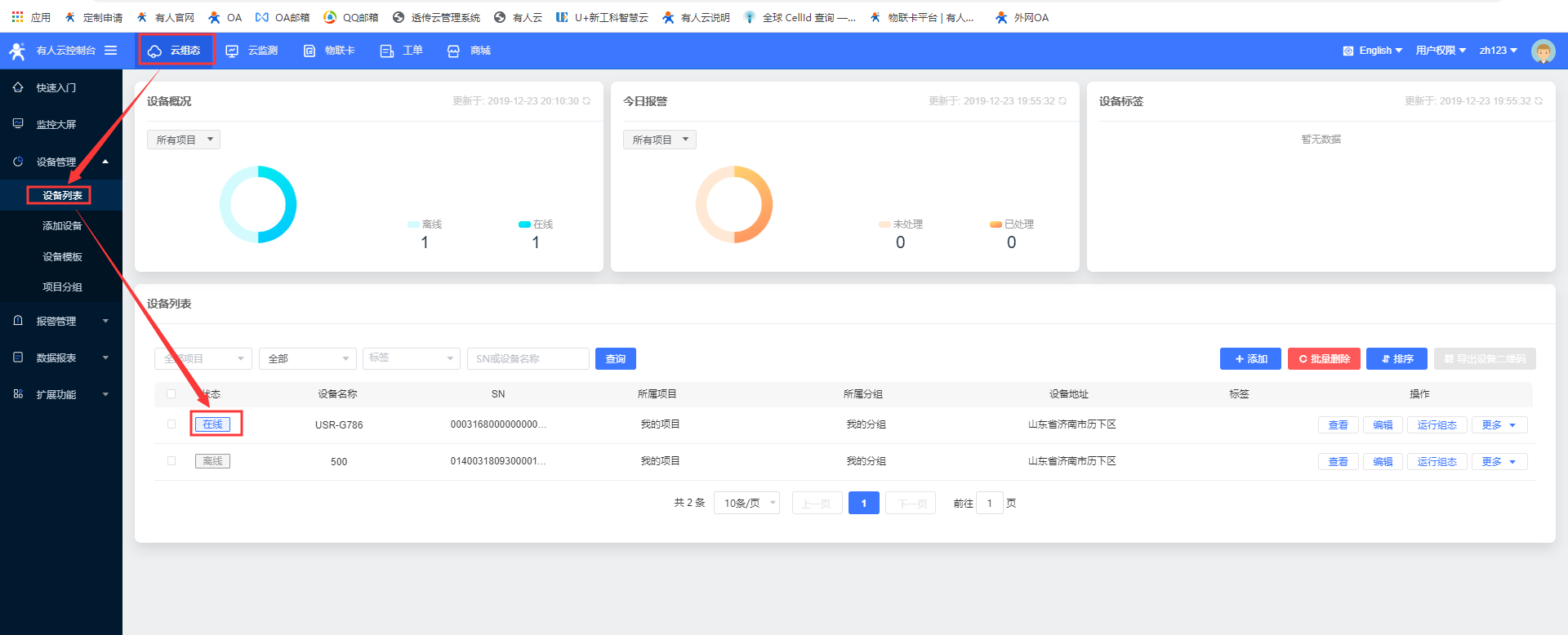 14、等待设备重启以后,在有人云界面就可以看到USR-G786上线;