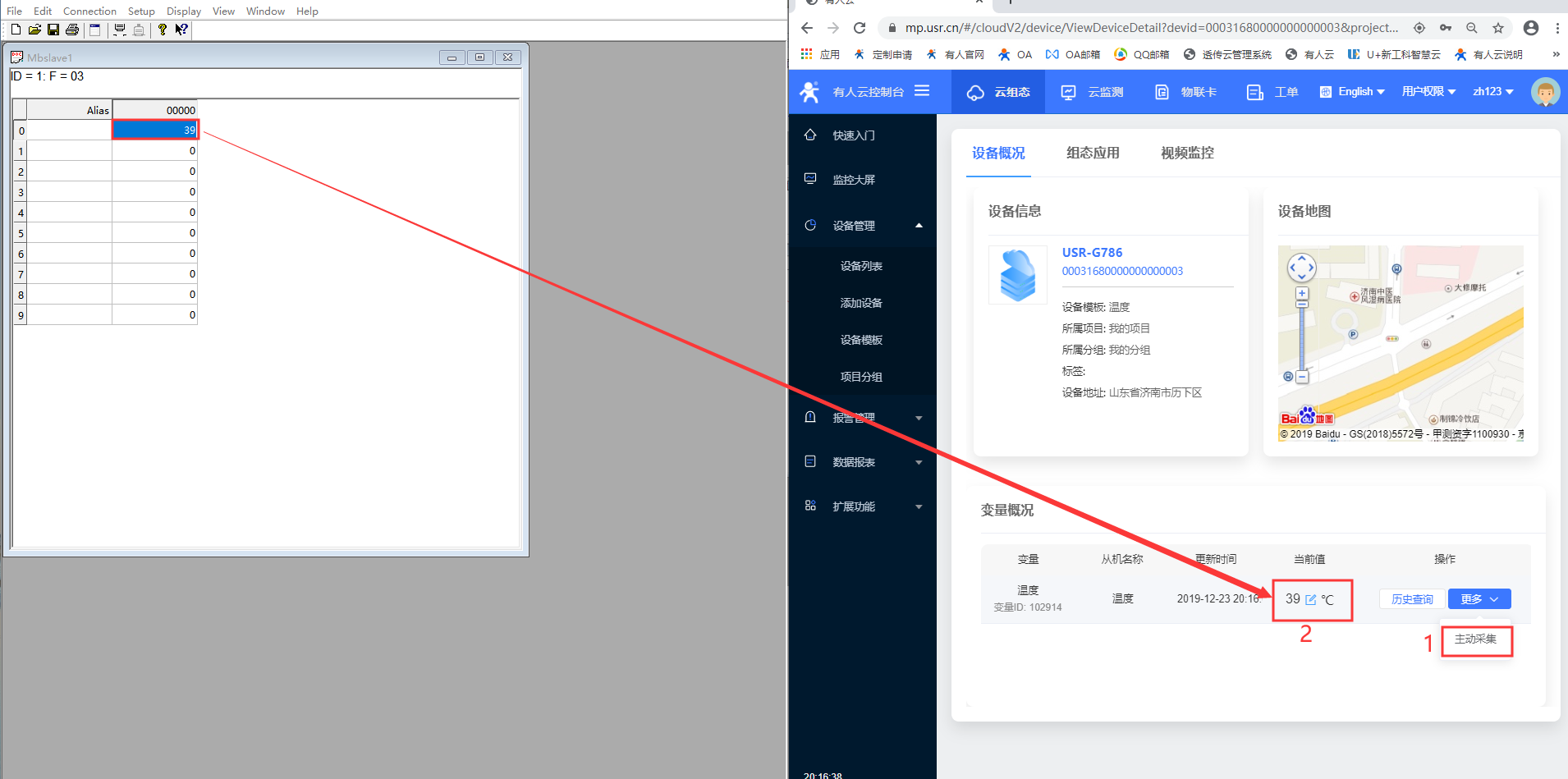 18、在有人云界面点击主动采集,即可立即采集到对应的温度数据(若设备模板设置主动采集,则有人云会按照采集频率主动下发采集指令,本案例设置采集频率为1分钟);