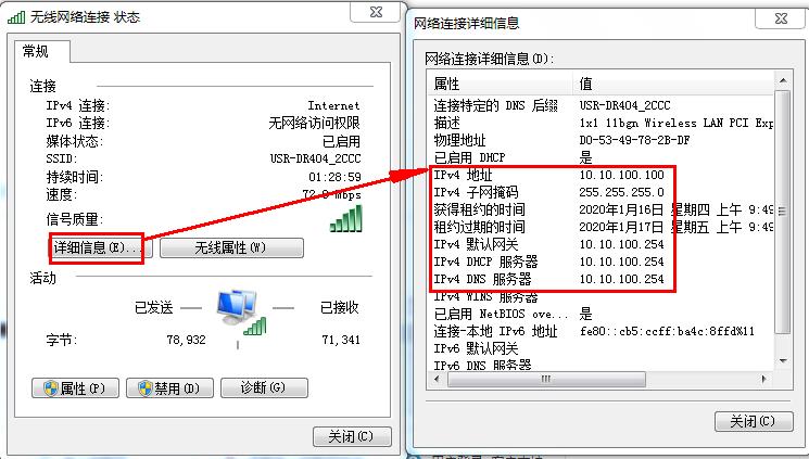 可以通过无线网络连接,去查看状态,点击详细信息,就可以看到电脑连接USR-DR404,电脑的IP是10.10.100.100。