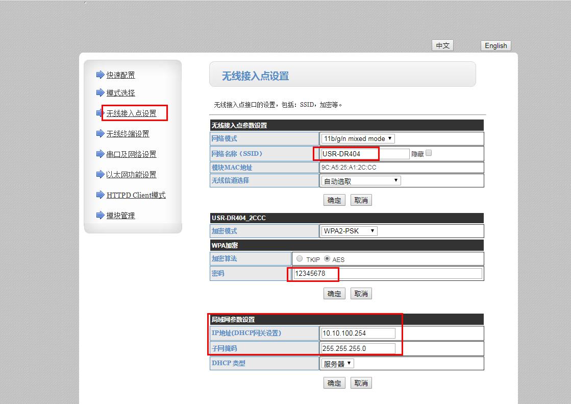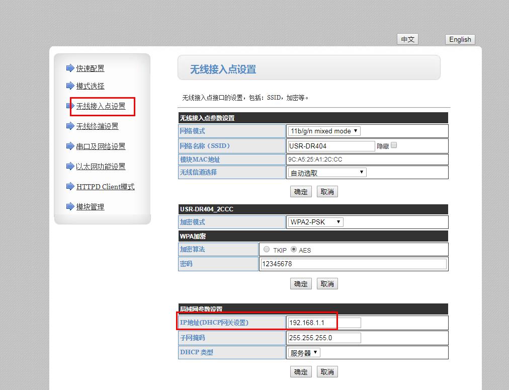 5、第一个USR-DR404配置AP模式参数: