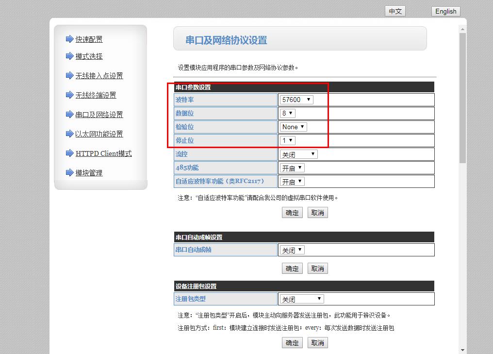 USR-DR404默认串口参数是57600,NONE,8,1