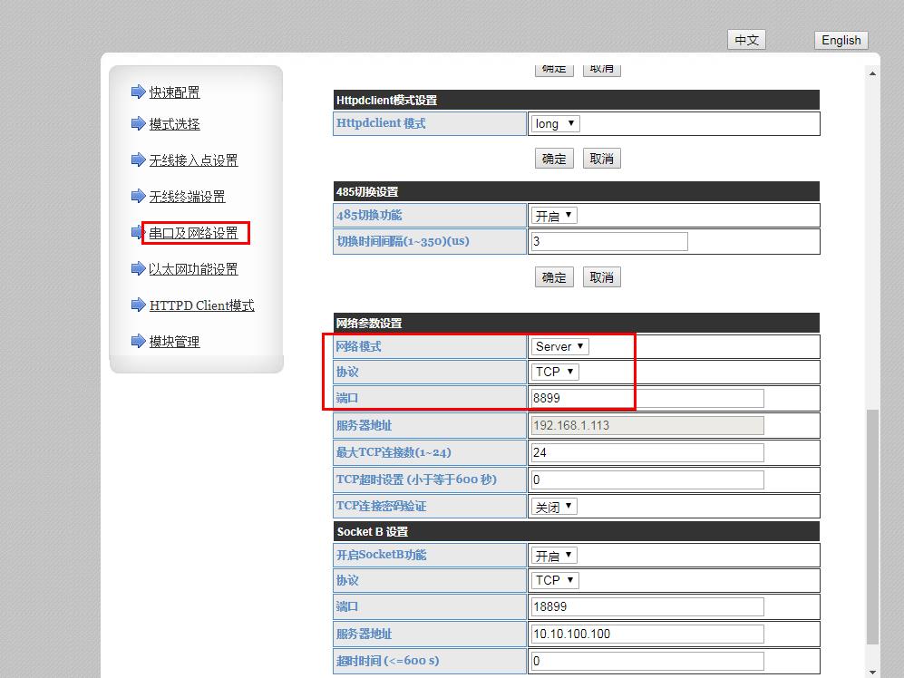 在串口及网络设置,设置串口参数,设置工作模式设置TCP server模式。本地端口8899。